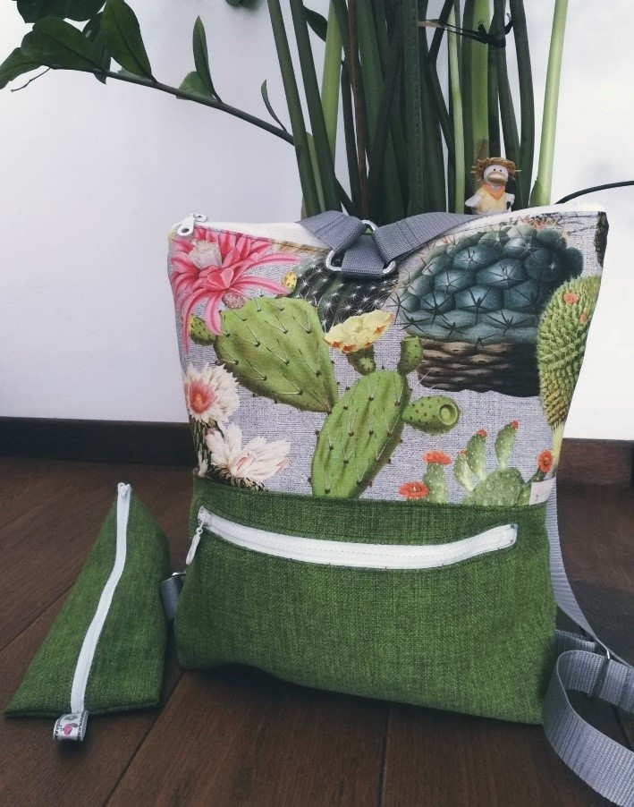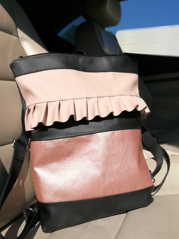 Malo kasneje sem začela delat tudi drugačne nahrbtnike, na naramnice in z zapiranjem na zadrgo. Večina jih je še vedno narejenih iz umetnega usnja, meni pa so zelo ljubi takšni v kombinaciji z dekorativnim materialom.